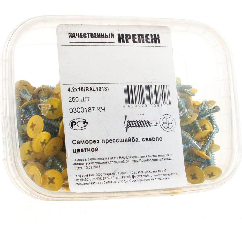 Прессшайба Качественный КРЕПЕЖ 4.2х16 мм, желтый цинк RAL 1018, сверло, 250 шт 0300187 КЧ