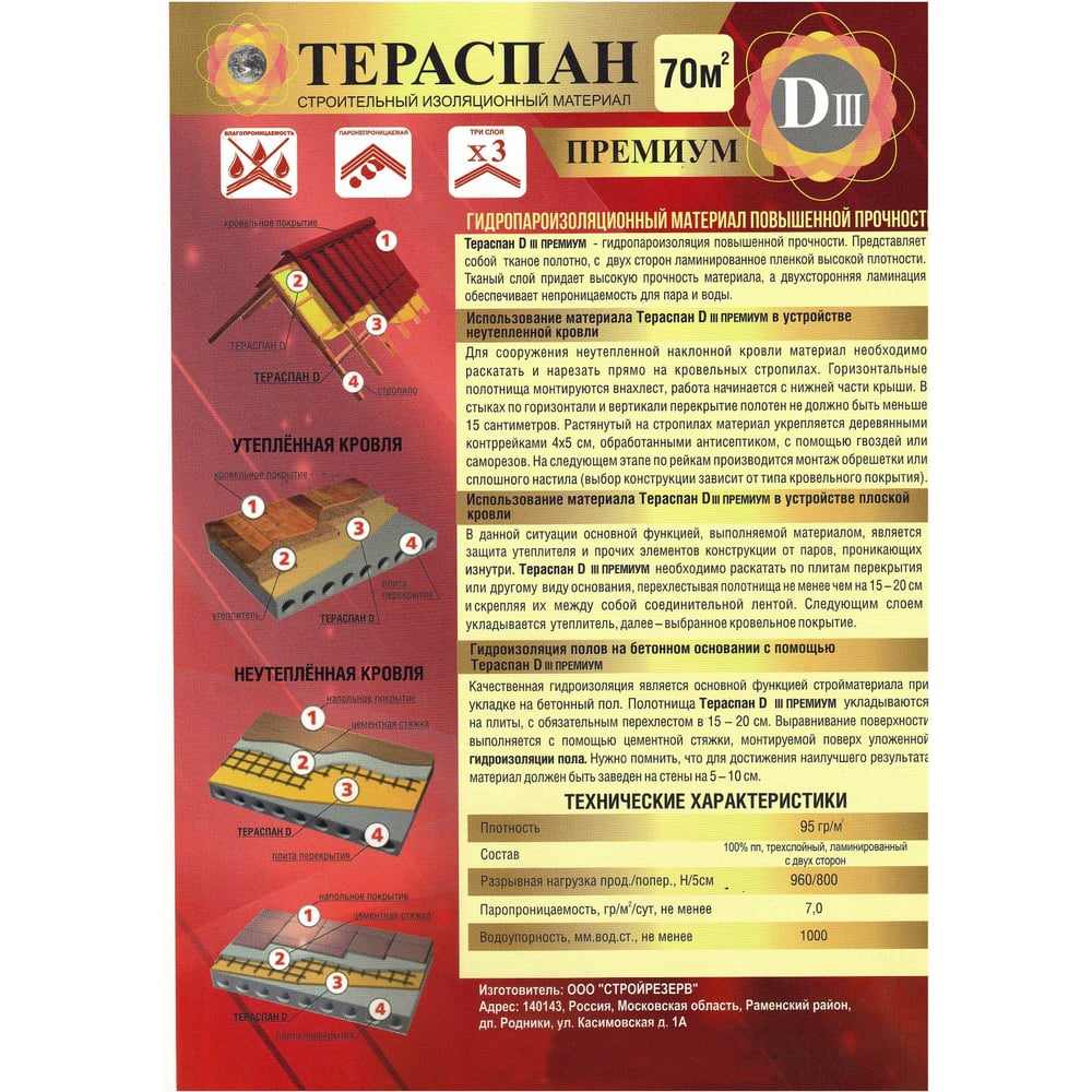 Двухслойный гидро-пароизоляционный материал ТЕРАСПАН Д III ПРЕМИУМ повышенной прочности, 70 кв. м 4660077150433