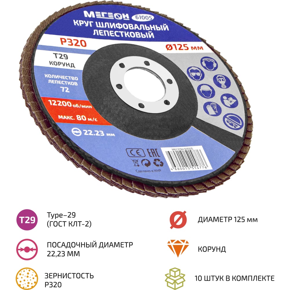 Круг шлифовальный лепестковый 125 мм, P320, 10 шт 61005-10 МЕГЕОН к0000396366