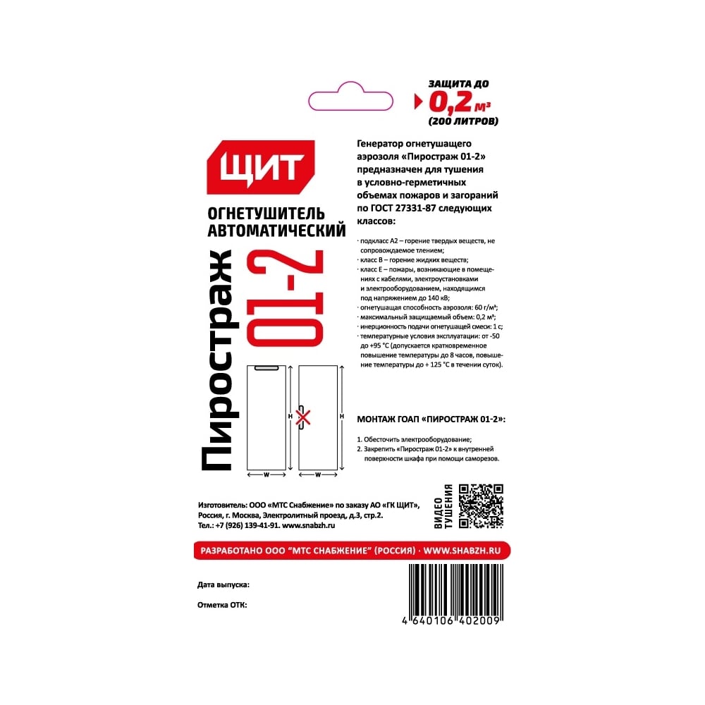 | Масса аэрозолеобразуещего заряда | 0.02 кг |