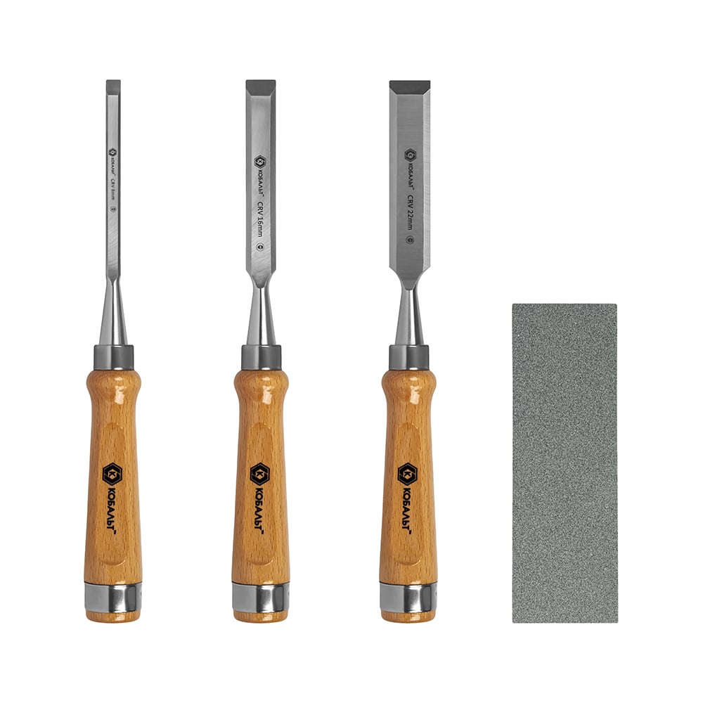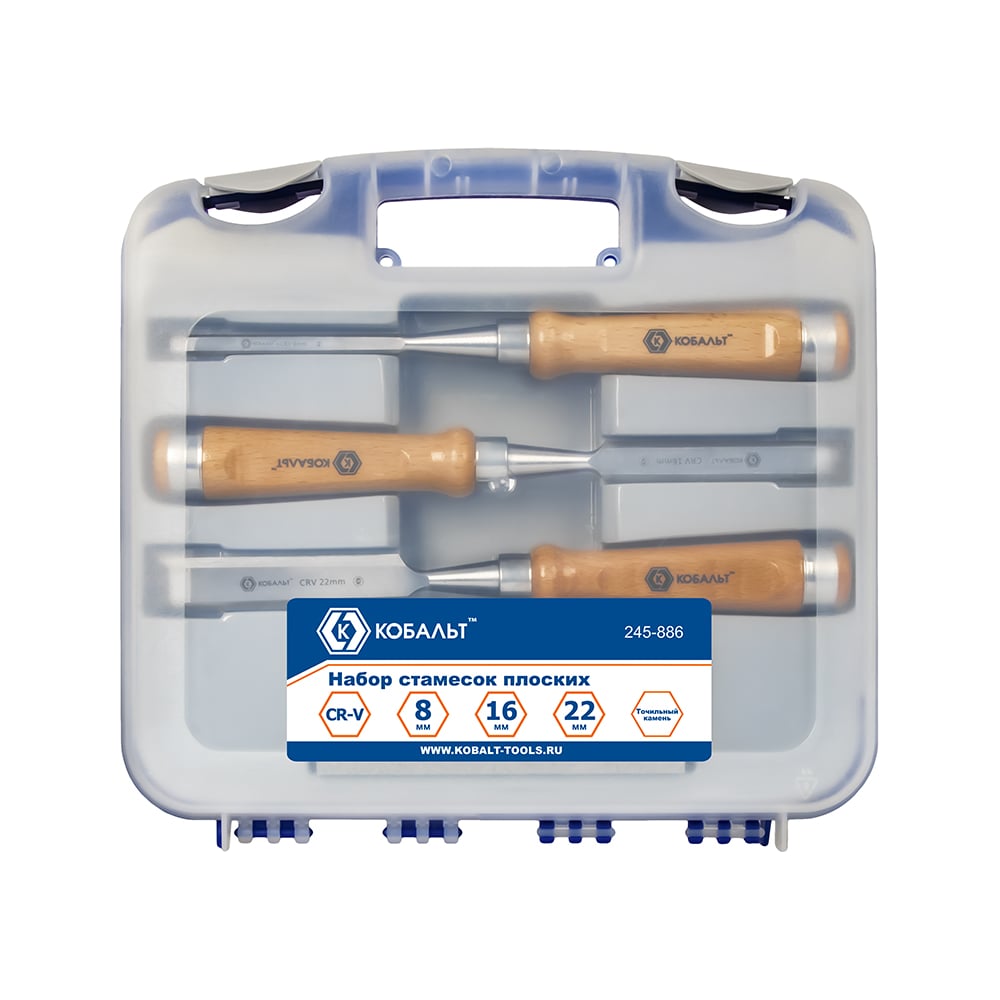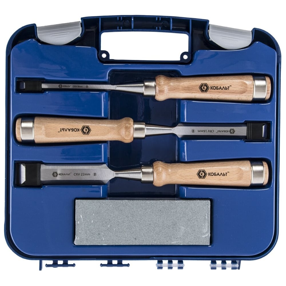 Набор плоских стамесок: 8, 16, 22мм, длина 140мм, CR-V, деревянные рукоятки, точильный камень, 3шт, кейс КОБАЛЬТ 245-886