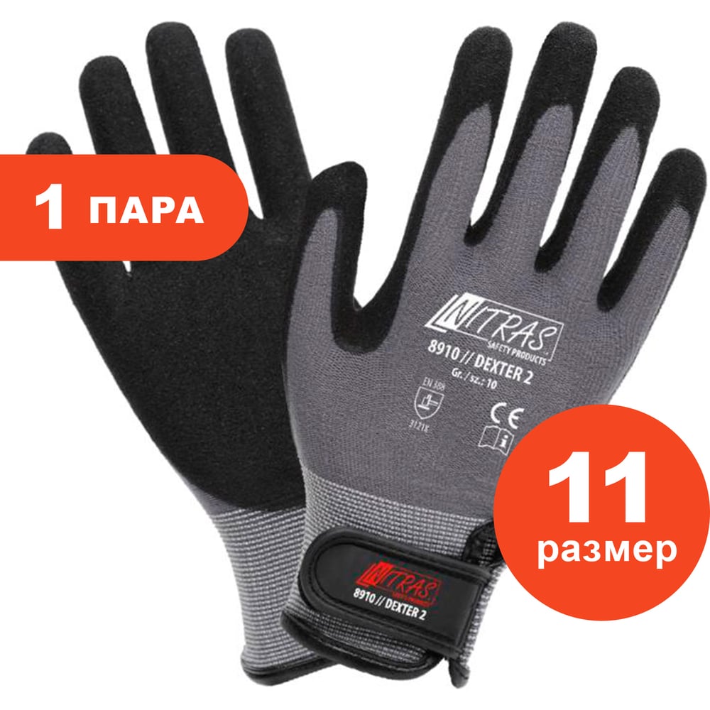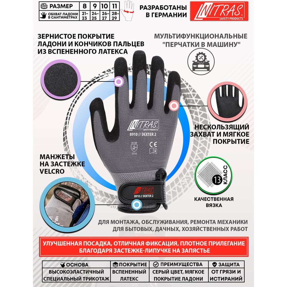Трикотажные перчатки Nitras латексное рифленое покрытие ладони и пальцев, липучка, 13G, р 11 8910-111