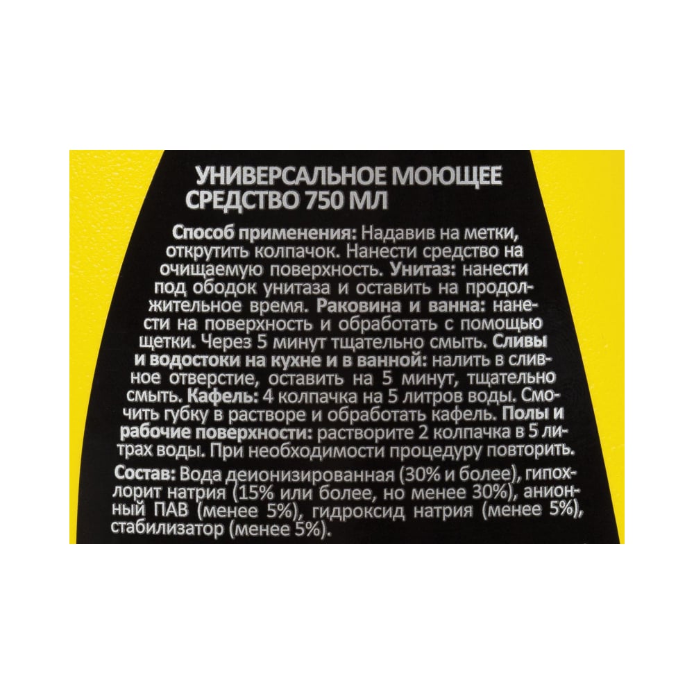 | Состав | вода деионизированная (30% и более), гипохлорит натрия (15% или более, но менее 30%), анионный ПАВ (менее 5%), гидроксид натрия (менее 5%), стабилизатор (менее 5%) |