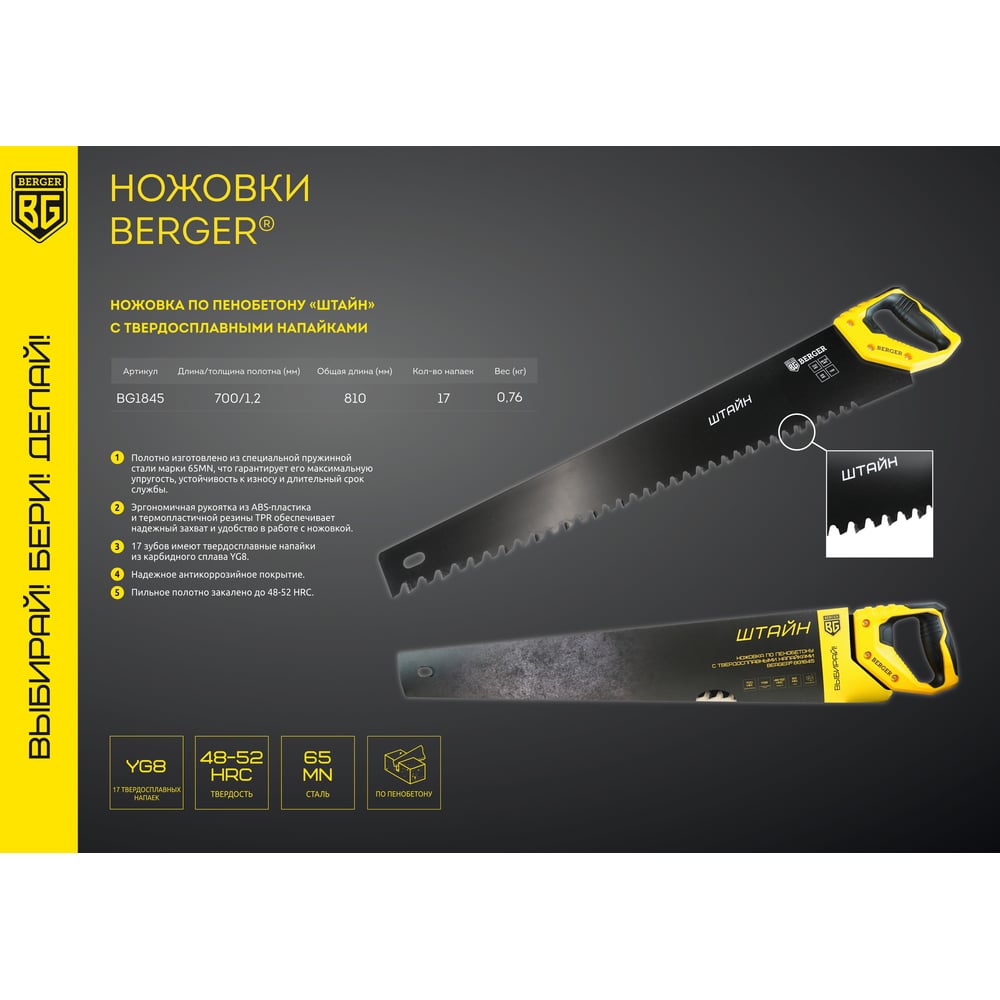 Ножовка по пенобетону Berger BG 700мм с твердосплавными напайками BG1845