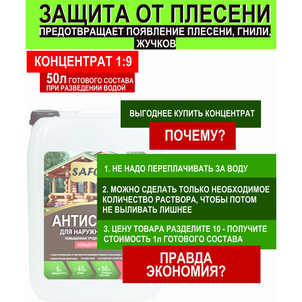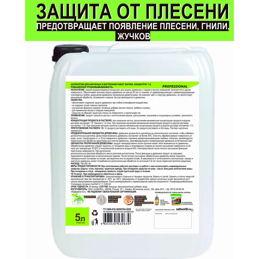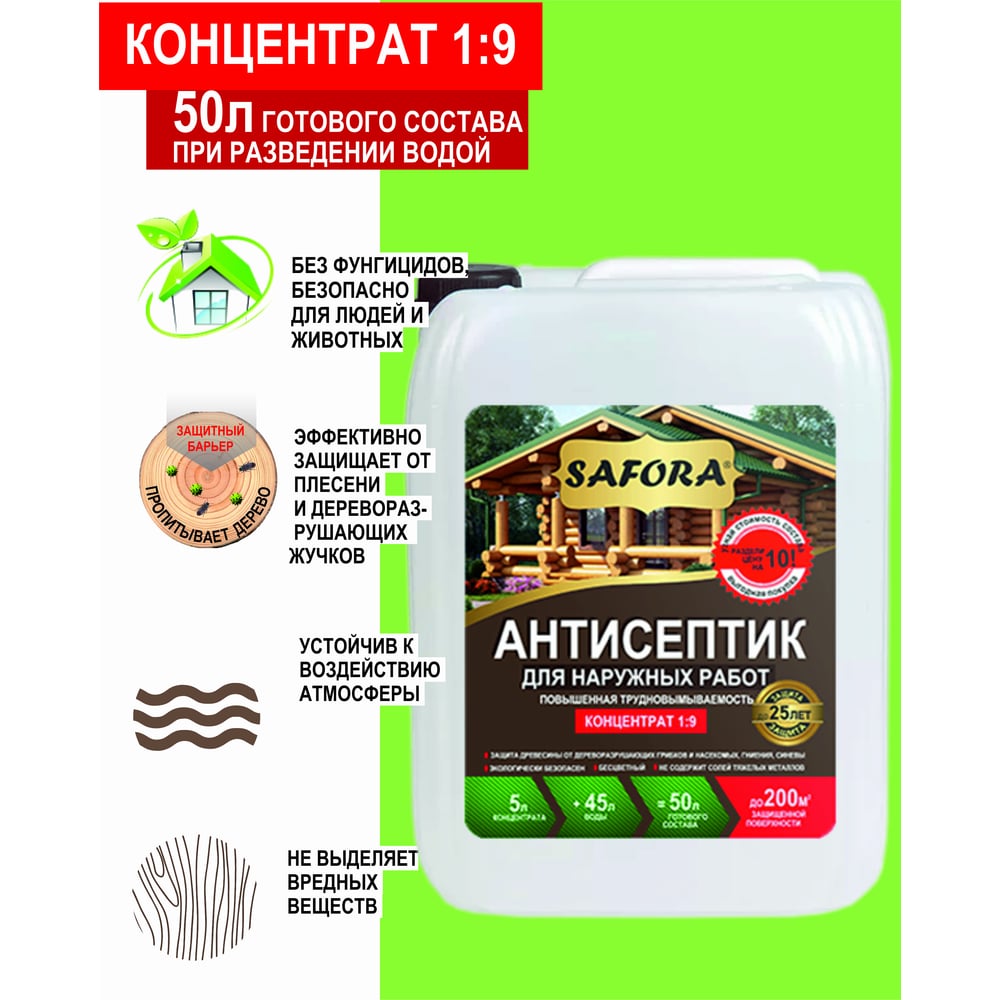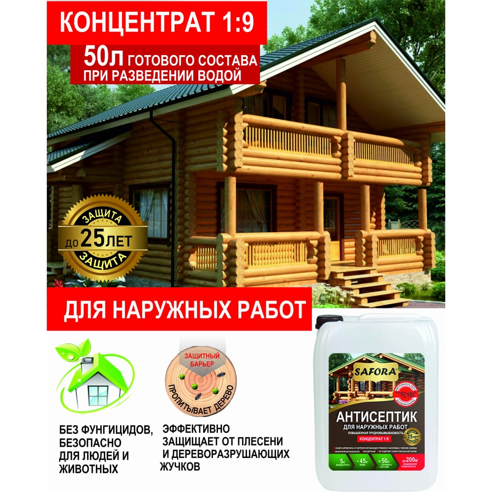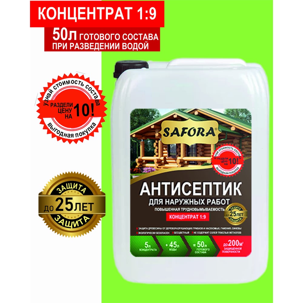 Антисептик для дерева, для фасадных и внутренних работ SAFORA (концентрат 1:9; 5 литров) АН05