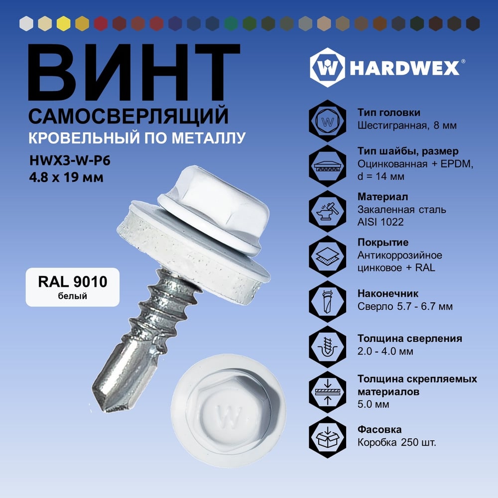 Саморез кровельный по металлу HARDWEX ТМ HWX4-W-P7-4.8x19 мм, св.№2, RAL 9010, 250 шт. 5190000000690