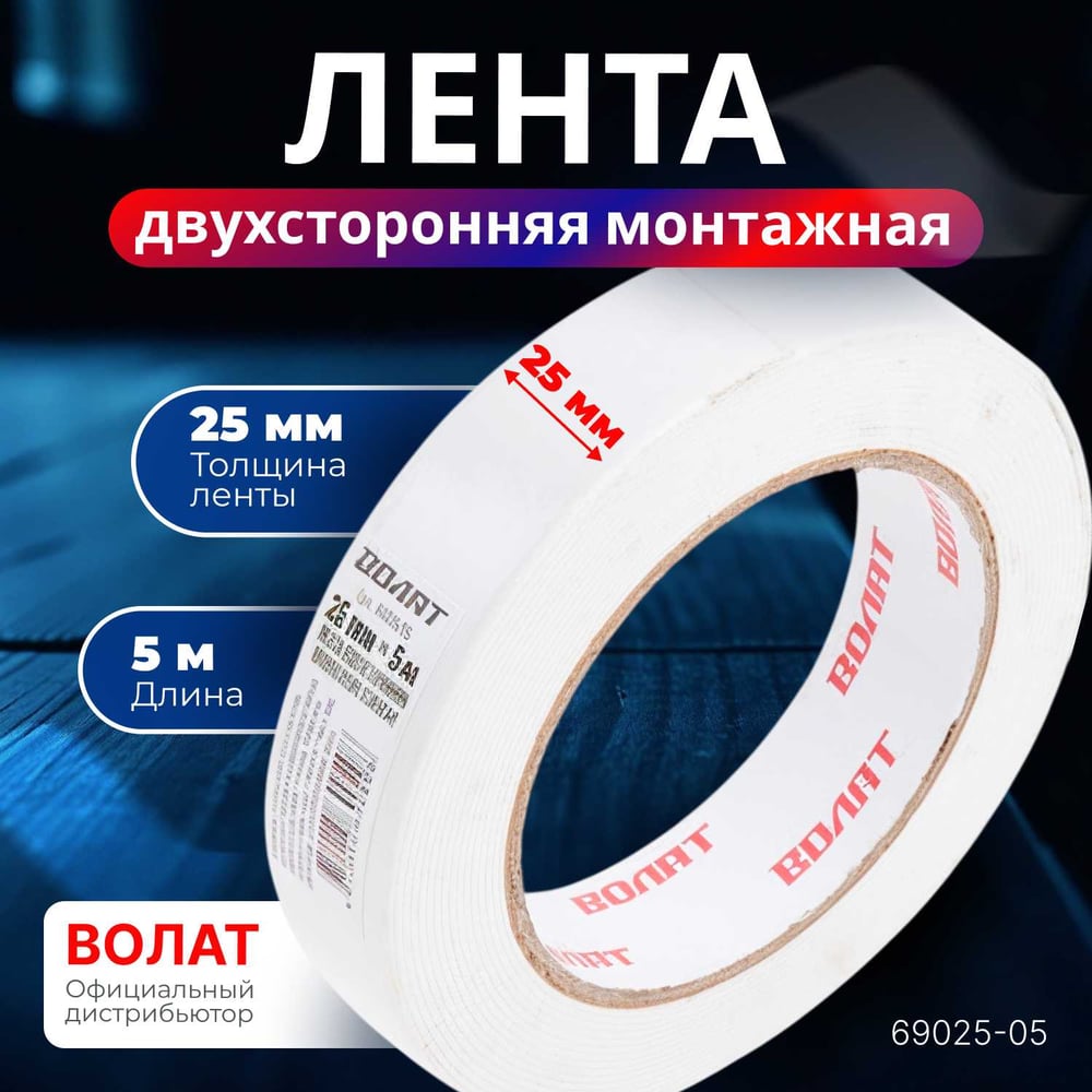 Двухсторонняя монтажная клейкая лента ВОЛАТ 25 мм, 5 м 69025-05