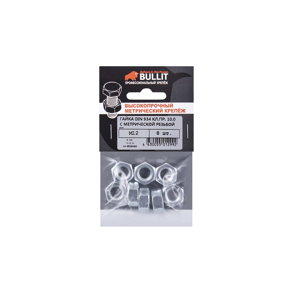 Гайка с метрической резьбой Bullit DIN 934, 10.0, M12, 8 шт 14-0018480
