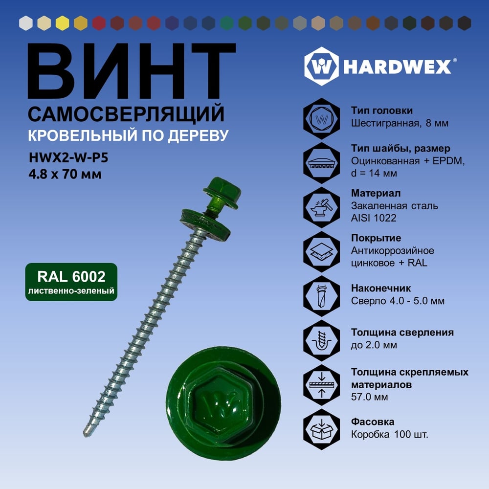 Саморез кровельный по дереву HARDWEX ТМ HWX2-W-P5-4.8x70 мм, св.№1, RAL 6002, 100 шт. 5190000023347