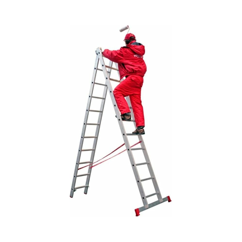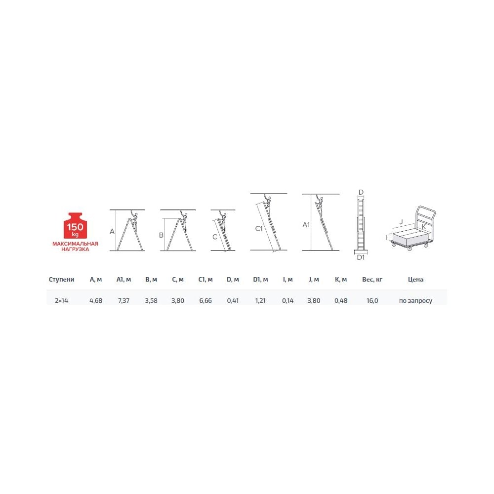 Материал алюминий Тип двухсекционная Класс товара Профессиональный Вес нетто 16.2 кг Размер в сложенном состоянии 380х480 см Рабочая высота 7.37 м Max рабочая нагрузка 150 кг Общая длина 6.66 м Ширина ступеней 28 мм Ширина лестницы 400 мм min длина в сложенном состоянии 3.8 м Количество ступеней 2х14 шт Толщина профиля 1.2 мм Телескопическая нет Max длина 6.66 м Min длина 3.8 м Стремянка да