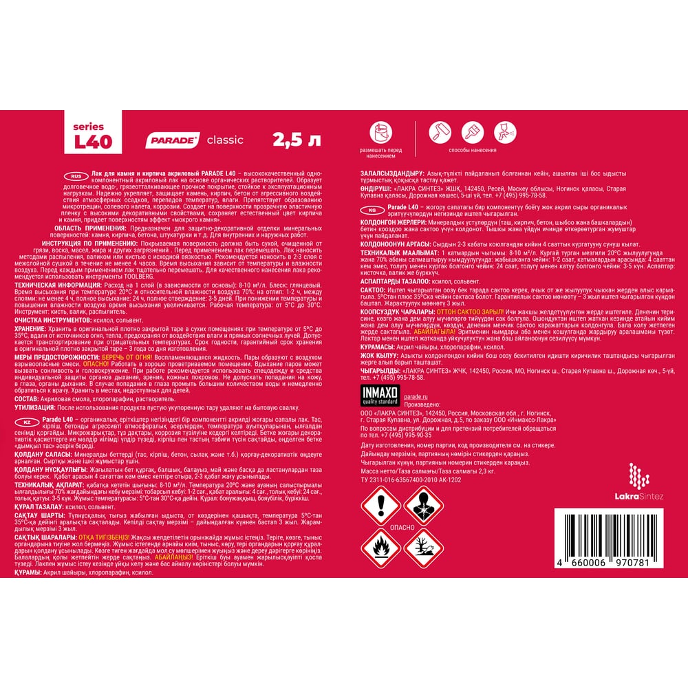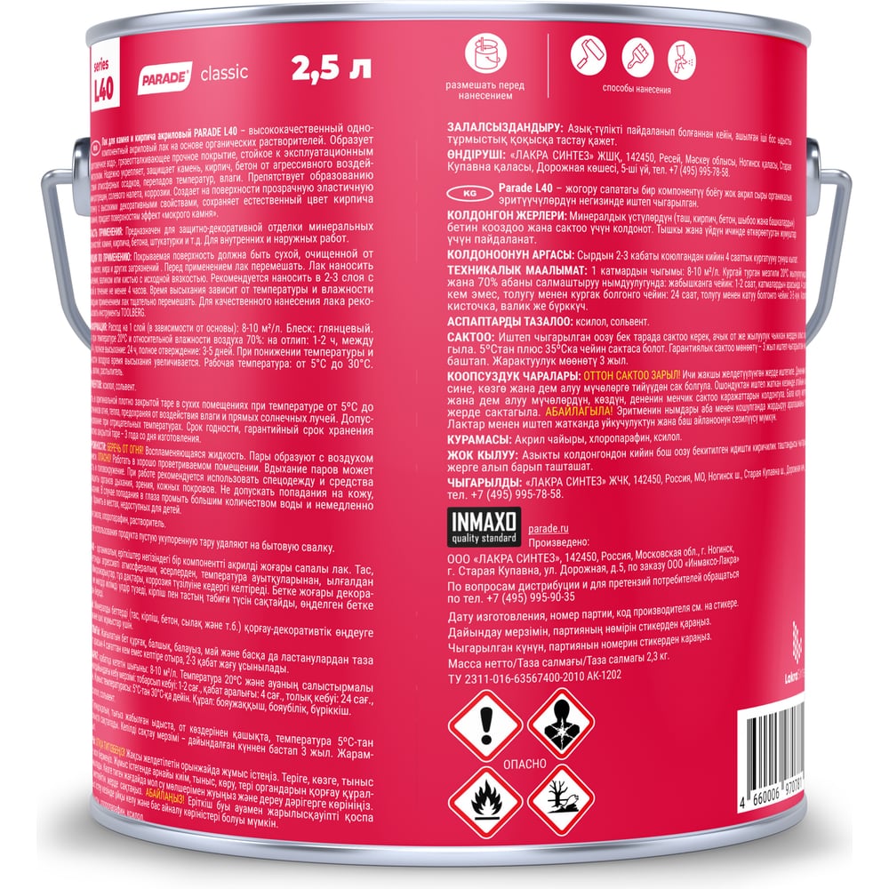 Лак для камня PARADE акриловый на растворителе L40 Камень & Кирпич глянцевый 2,5 л Россия 90003467462