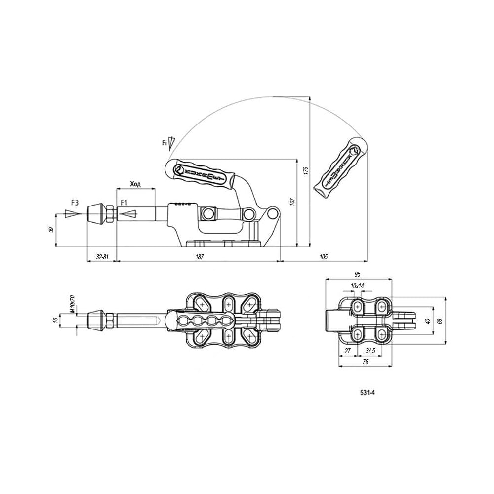 Плунжерный зажим с горизонтальным кронштейном KUKAMET, усилие 450 кг 531-4-Q16