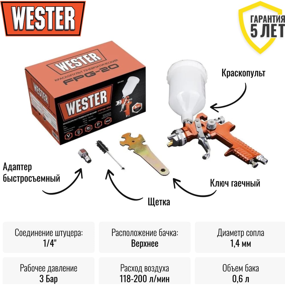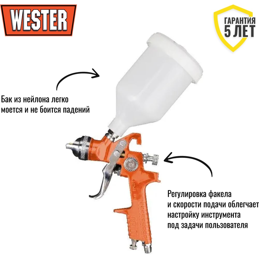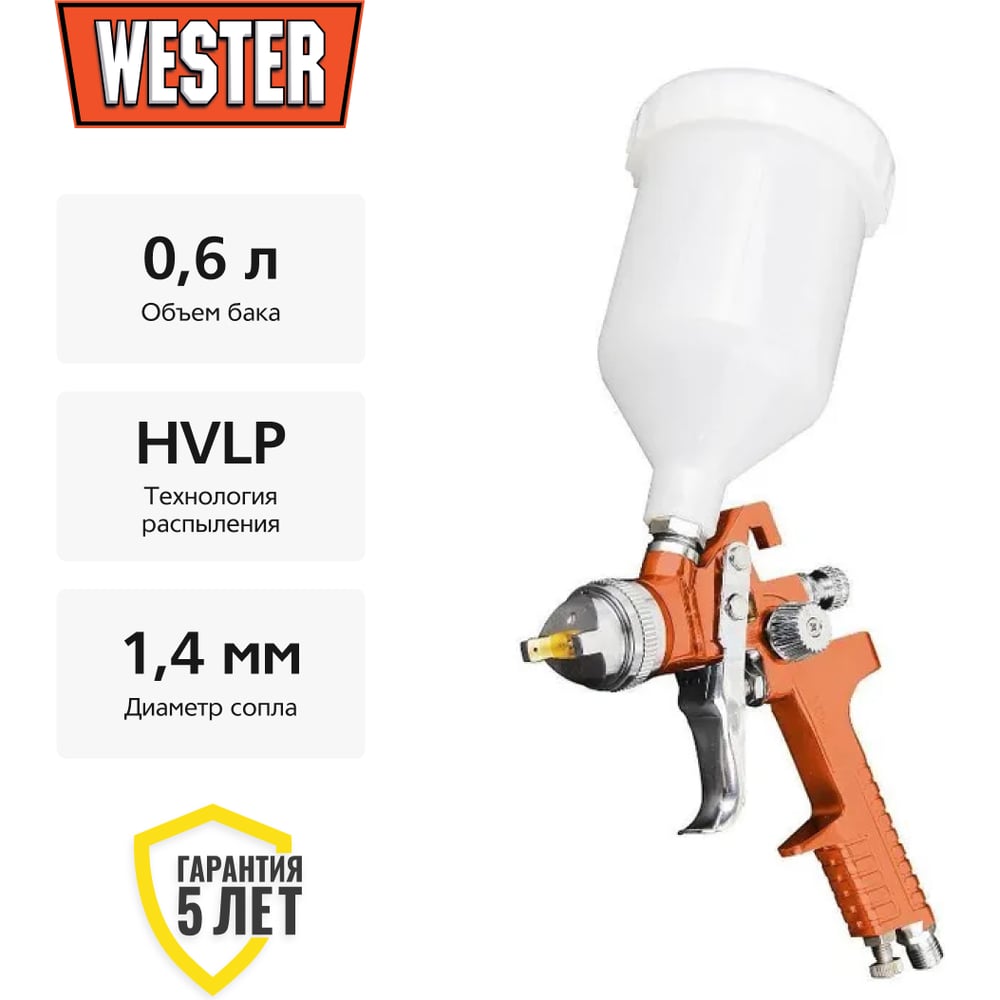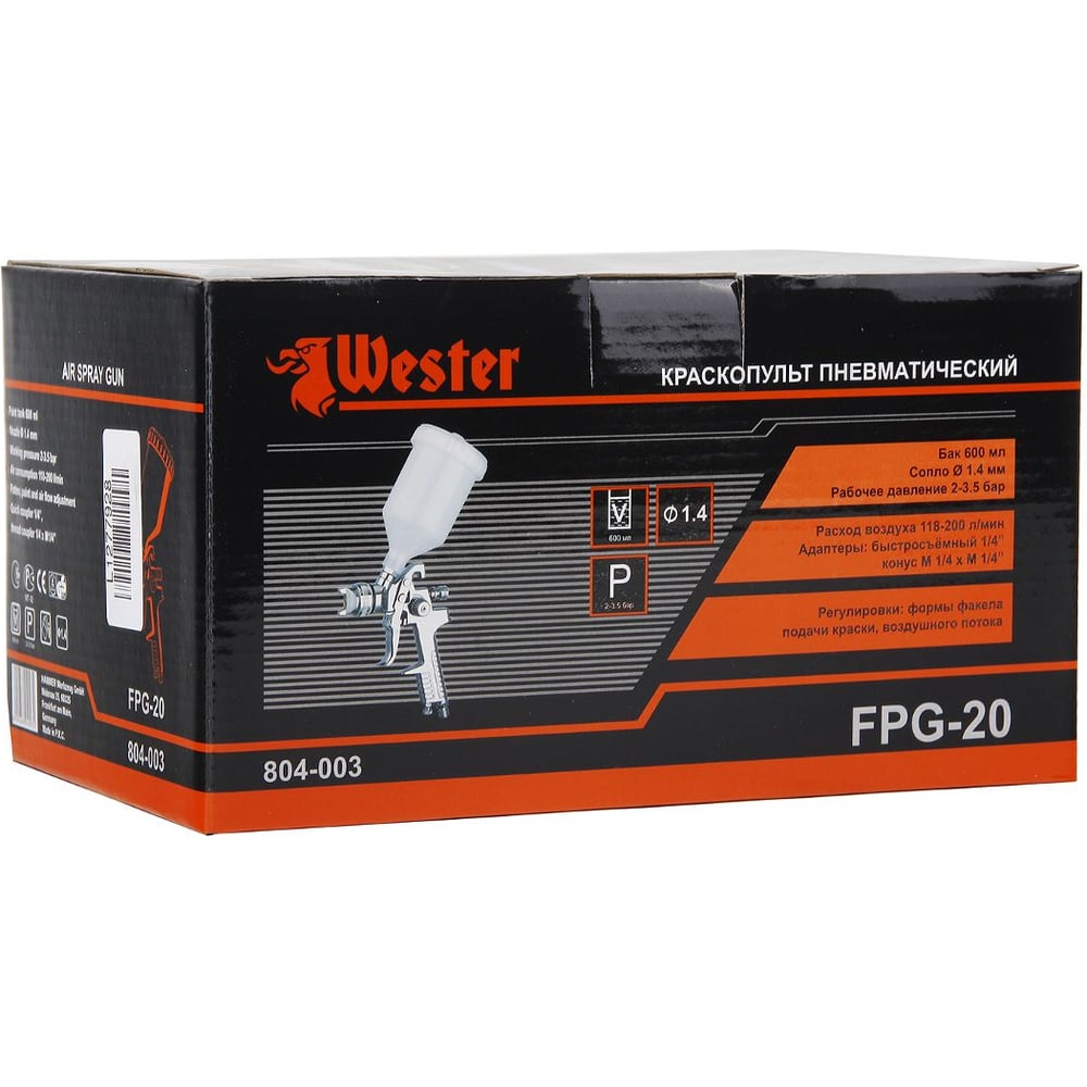 Краскопульт Wester FPG-20 HVLP, сопло 1.4 мм, макс. 200 л/мин, бак 0.6 л 55183