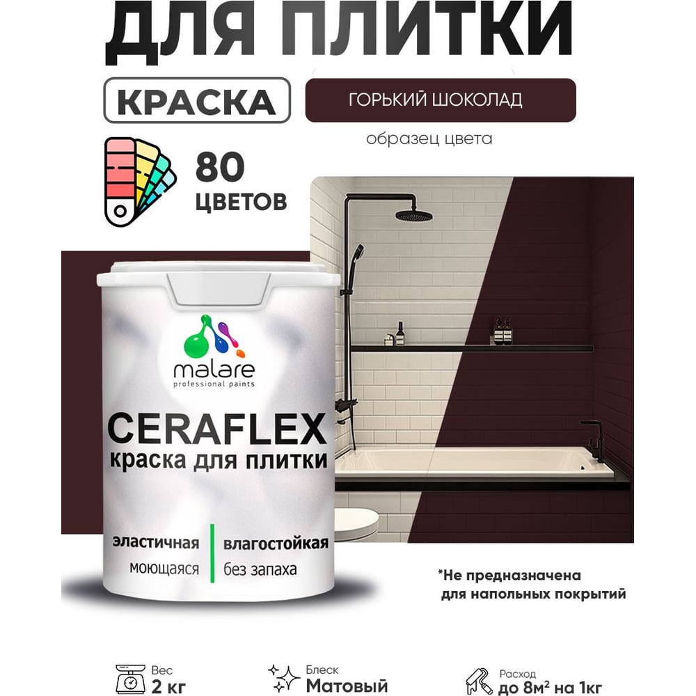 Краска акриловая MALARE Ceraflex для плитки, горький шоколад, матовый, 2 кг ККРФЛКСАГОШМ0200