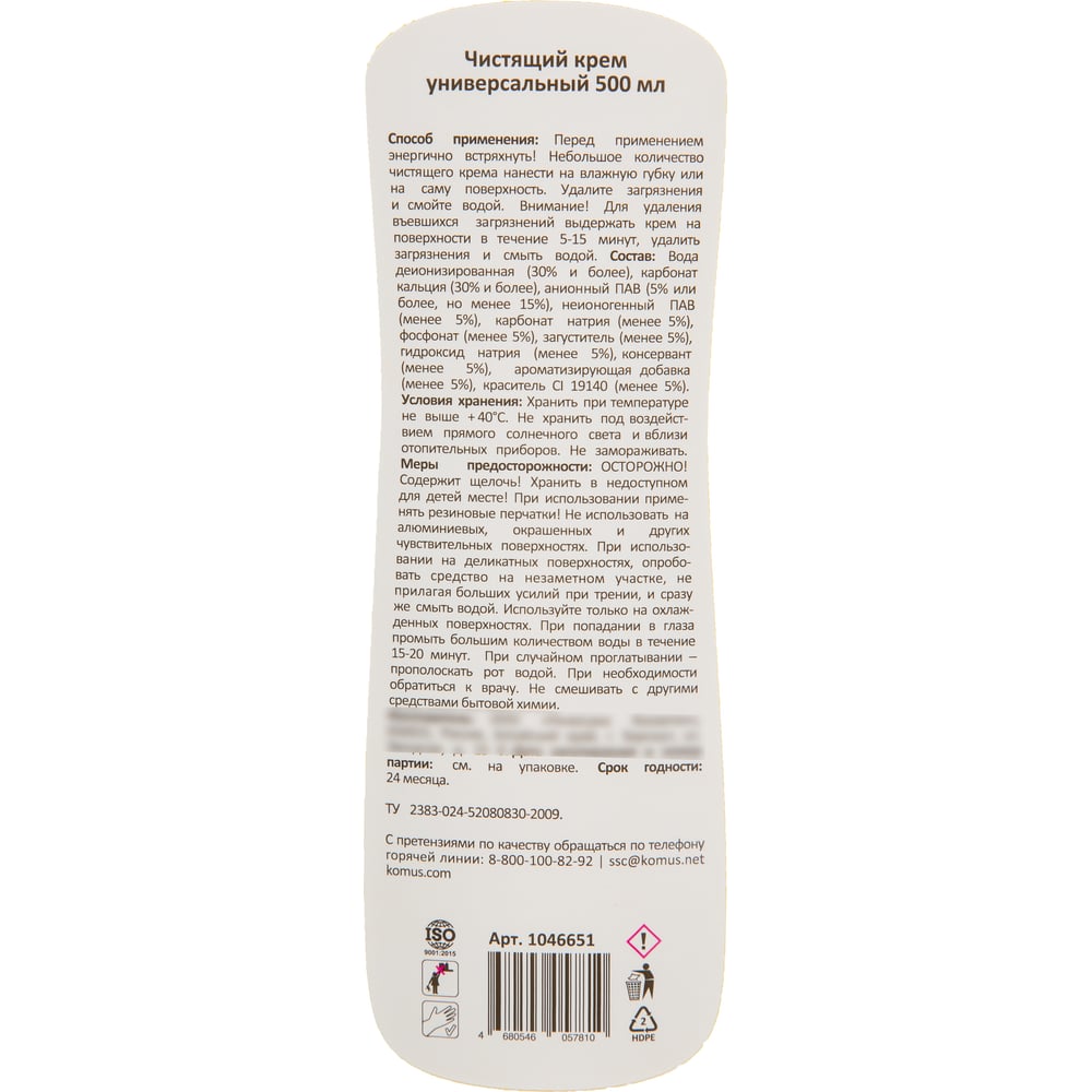 | Состав | Вода деионизированная, карбонат кальция, анионный ПАВ, неионогенный ПАВ, карбонат натрия, фосфонат, загуститель, гидроксид натрия, консервант, ароматизирующая добавка, краситель CI 19140. |