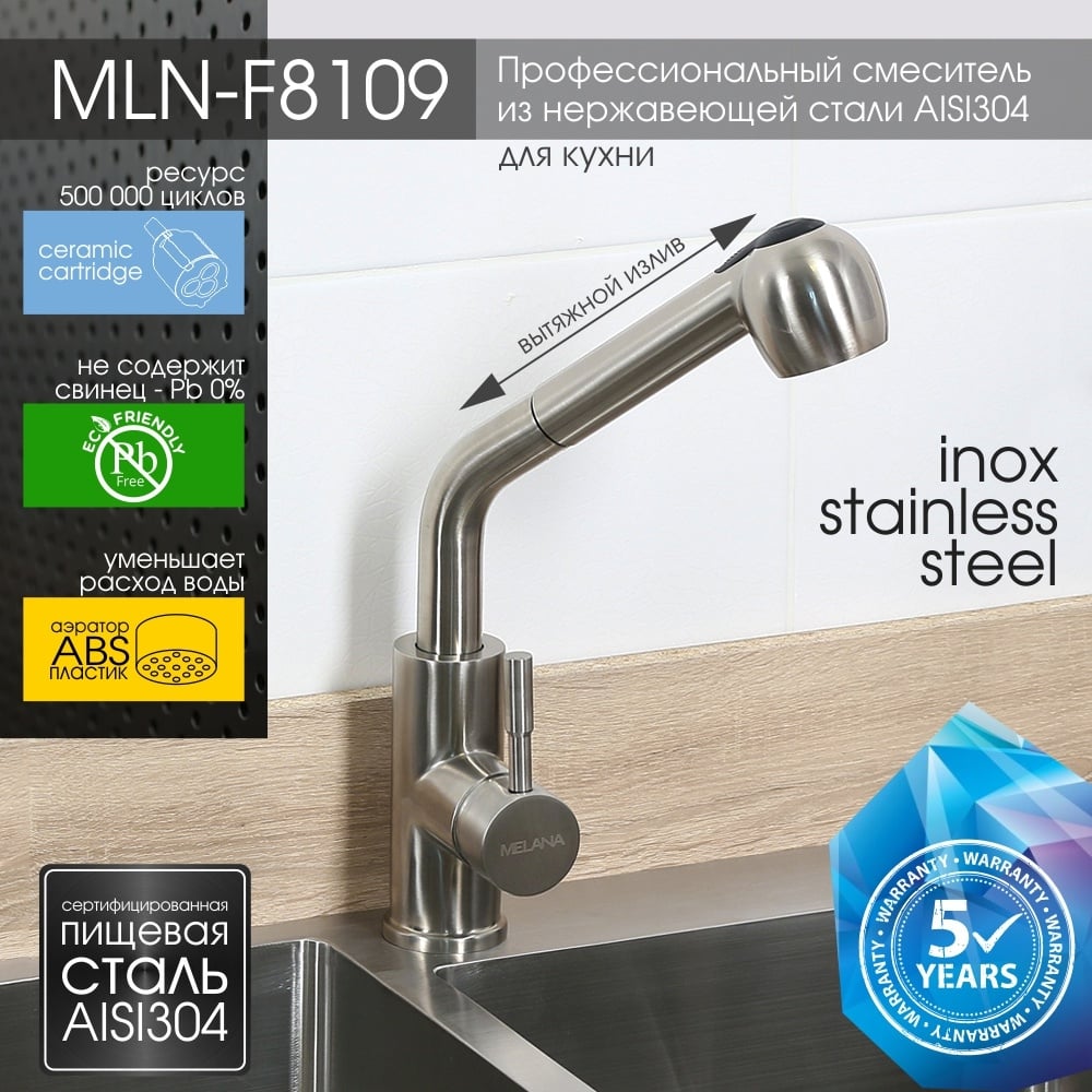 Смеситель для кухни MELANA нерж.сталь, однорычажный, сатин, вытяжной излив 8109