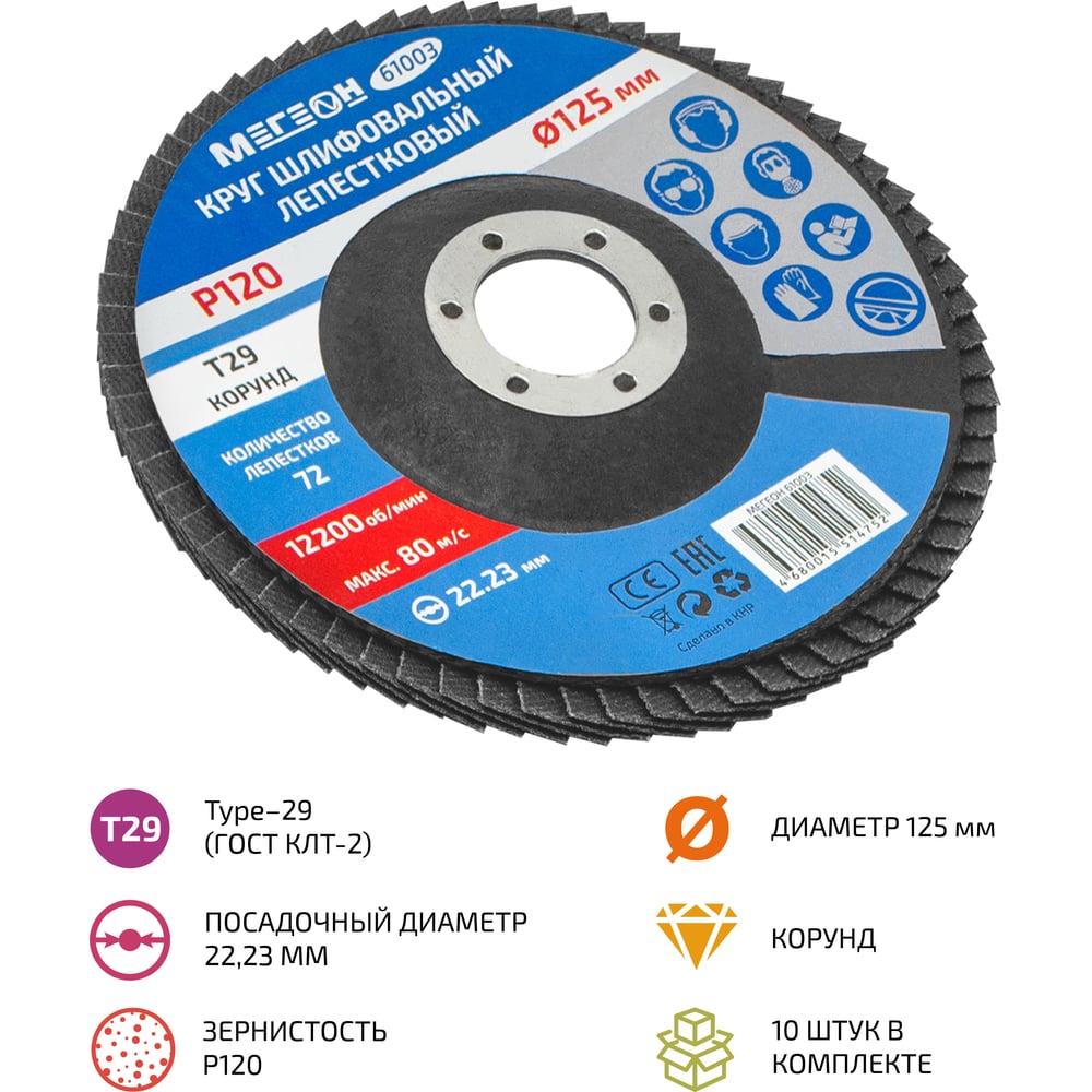 Круг шлифовальный лепестковый 125 мм, P120, 10 шт 61003-10 МЕГЕОН к0000396364