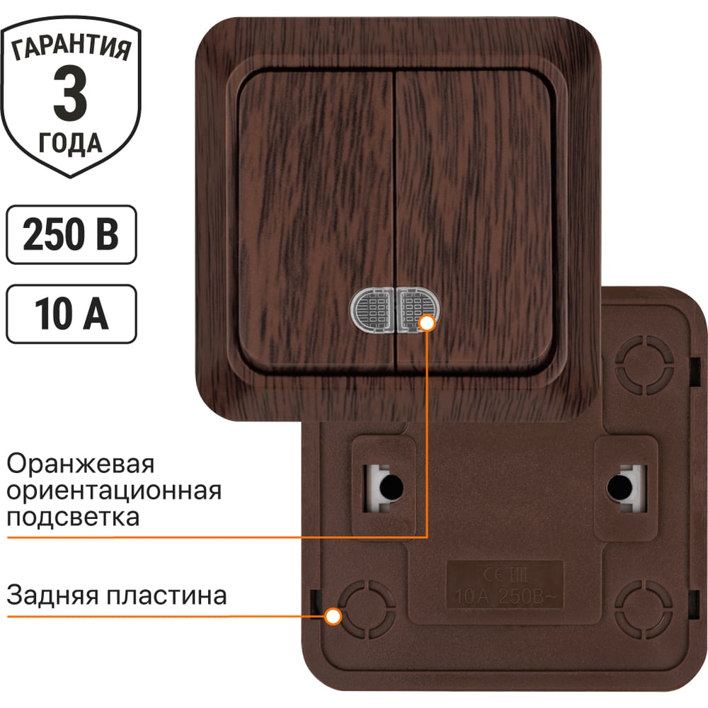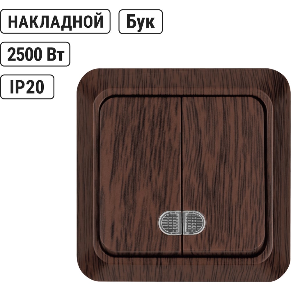 Выключатель TDM ELECTRIC 2-кл. открытой установки с подсветкой IP20 10А, бук, серия "Ладога" SQ1801-0030
