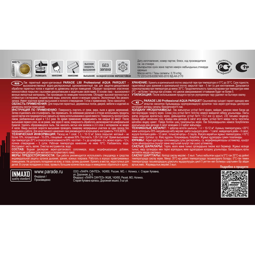 Паркетный акрил-уретановый лак PARADE Professional L50 AQUA PARQUET Лк-00004104
