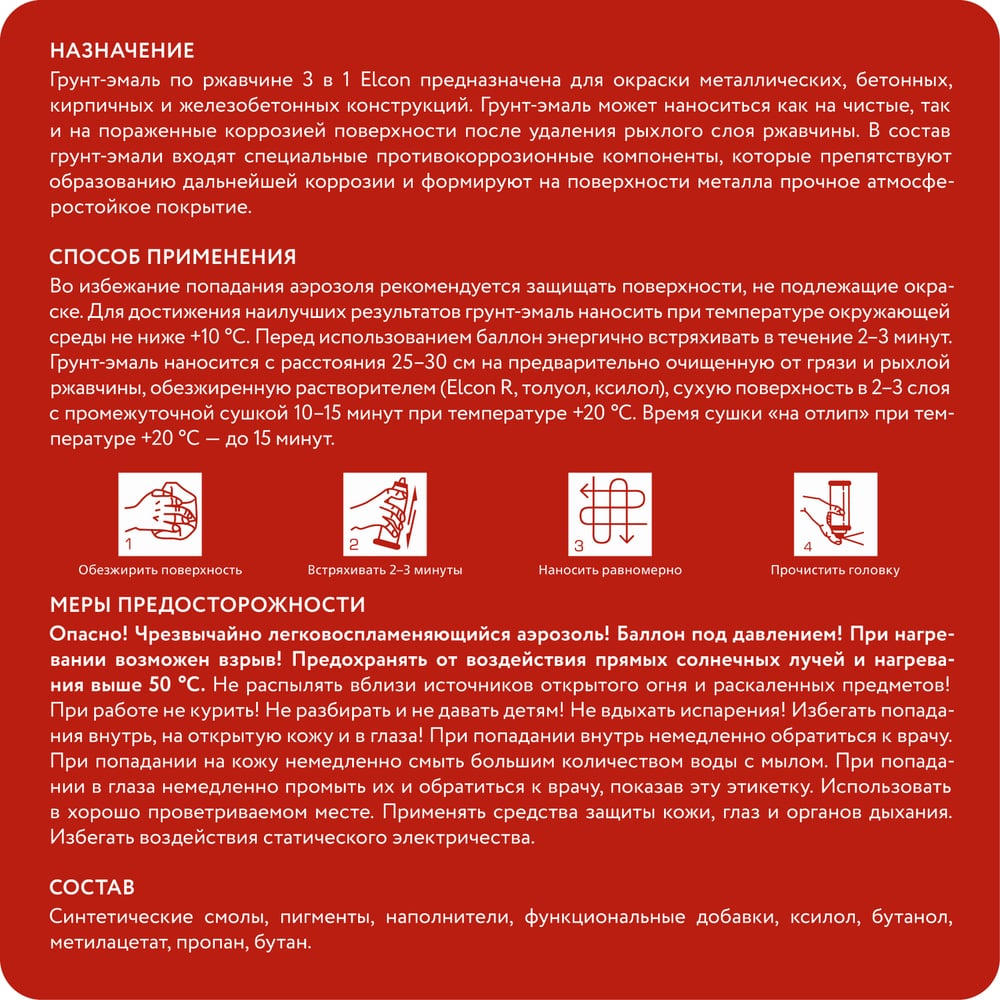 | Свойства | преобразователь ржавчины/антикоррозионный грунт/износостойкий финишный слой |
