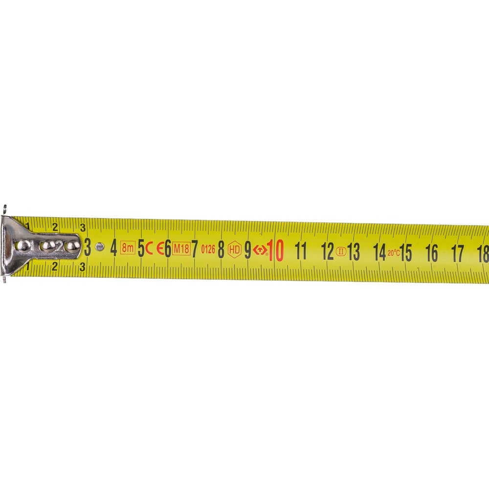 Тип рулетка Класс товара Профессиональный Вес нетто 0.365 кг Материал корпуса ABS-пластик Подсветка нет Длина 8 м Класс точности нет сертификации по классу точности Поверка нет Внесен в госреестр нет Ширина ленты 25 мм Магнитный зацеп есть Цвет ленты желтый Измерительная шкала сантиметры Материал ленты металл Автостоп нет Двусторонняя шкала нет Батарейки не требуются Тип нанесения разметки краска Двухсторонний зацеп нет Размер ленты 8м х 25мм Клипса для крепления на ремень да Смотровое окошко нет