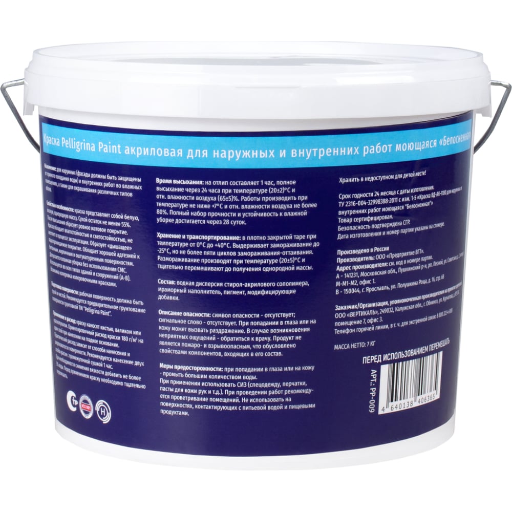 Акриловая краска PELLIGRINA PAINT для наружных и внутренних работ, моющаяся, белоснежная, 7 кг 231212