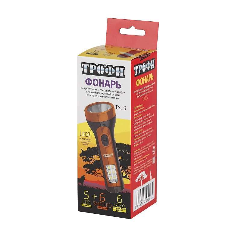 Фонарь аккумуляторный ручной TA15 5LED + 6SMD 2в1 аккум. 4В 1А.ч евровилка (картон. упак.) Трофи Б0016863