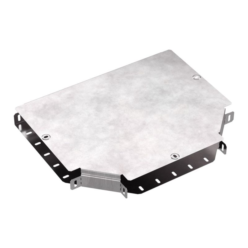 Аксессуары изготовленные из стали с защитным покрытием по методу Сендзимира – это изделия, на которых защитное цинковое покрытие было нанесено на листовую сталь перед изготовлением. Толщина защитного покрытия варьируется от 10 до 22мкм. Климатическое исполнение изделий УХЛ2, что предусматривают эксплуатацию в помещении и под навесом, при температуре эксплуатации от -80 до +150°С. Т-образный ответвитель предназначен для разветвления кабельных трасс в горизонтальном направлении,для перфорированных и глухих лотков. В комплект входит крышка.