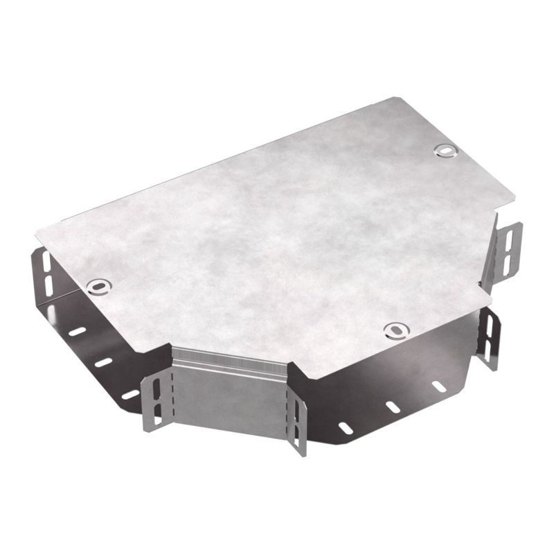 Аксессуары изготовленные из стали с защитным покрытием по методу Сендзимира – это изделия, на которых защитное цинковое покрытие было нанесено на листовую сталь перед изготовлением. Толщина защитного покрытия варьируется от 10 до 22мкм. Климатическое исполнение изделий УХЛ2, что предусматривают эксплуатацию в помещении и под навесом, при температуре эксплуатации от -80 до +150°С. Т-образный ответвитель предназначен для разветвления кабельных трасс в горизонтальном направлении,для перфорированных и глухих лотков. В комплект входит крышка.