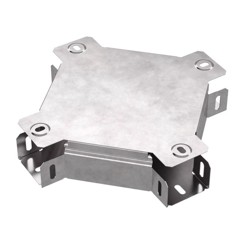Аксессуары изготовленные из стали с защитным покрытием по методу Сендзимира – это изделия, на которых защитное цинковое покрытие было нанесено на листовую сталь перед изготовлением. Толщина защитного покрытия варьируется от 10 до 22мкм. Климатическое исполнение изделий УХЛ2, что предусматривают эксплуатацию в помещении и под навесом, при температуре эксплуатации от -80 до +150°С. Ответвитель X-образный предназначен для разветвления кабельных трасс в горизонтальном направлении, для перфорированных и глухих лотков. В комплект входит крышка.