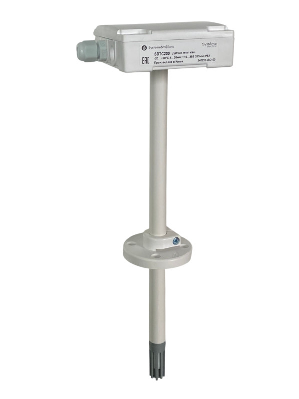 Датчик температуры канальный, для установки на воздуховод, монтажный фланец и кабельный ввод в комплекте, диапазон измерения -20…+80 °С, выходной сигнал 4…20 мА, длина погружной части 283 мм, глубина погружения 40…265 мм,винтовые клеммы, с клеммной головкой, с кабельным вводом, степень защиты корпуса IP53, электропитание от 15 до 35 В постоянного тока
