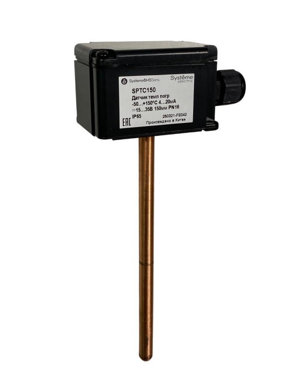 Датчик температуры погружной, диапазон измерения температуры -50…+150°С, выходной сигнал 4…20 мА, длина погружной части 150 мм, напряжение питания 15…35 В постоянного тока, с клеммной головкой, с кабельным вводом, в комплект поставки входит гильза 100 мм, степень защиты корпуса IP65, условия эксплуатации -40…+80°С
