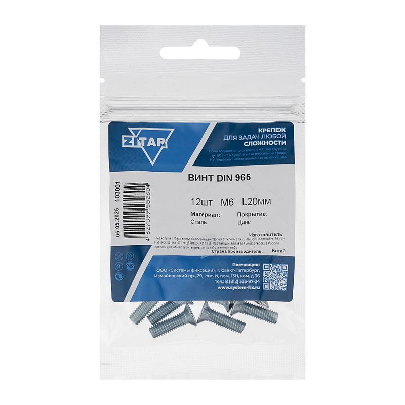 Винт с потайной головкой М6х20 DIN 965 оцинк. (уп.12шт) Tech-Krep/Zitar 103001