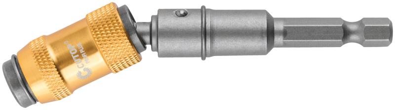 Адаптер шарнирный угловой с магнитным держателем для бит Cutop из инструментальной стали необходим при монтаже крепежа в труднодоступных местах (когда сложно работать оснасткой с прямым держателем). Шарнирный механизм позволяет работать при наклоне до 25 градусов. Биты не срываются и не повреждают поверхность.