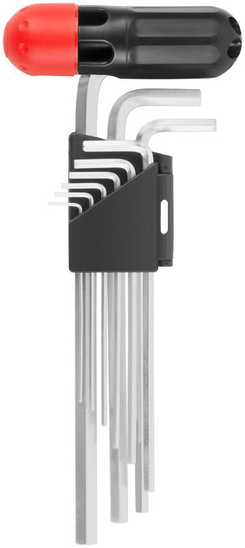 Набор шестигранных ключей FIT IT в складном пластиковом держателе предназначен для закручивания и откручивания крепежа с внутренним шестигранником при проведении ремонтных работ.T-образная ручка в комплекте повышает удобство работы. Увеличенная длина ключей позволяет передавать большее усилие во время работы. Ключи изготовлены из хром-ванадиевой стали, отличаются прочностью и износостойкостью. Хромированное покрытие ключей предотвращает коррозию. 9 ключей в комплекте обеспечивают широкий спектр применения.