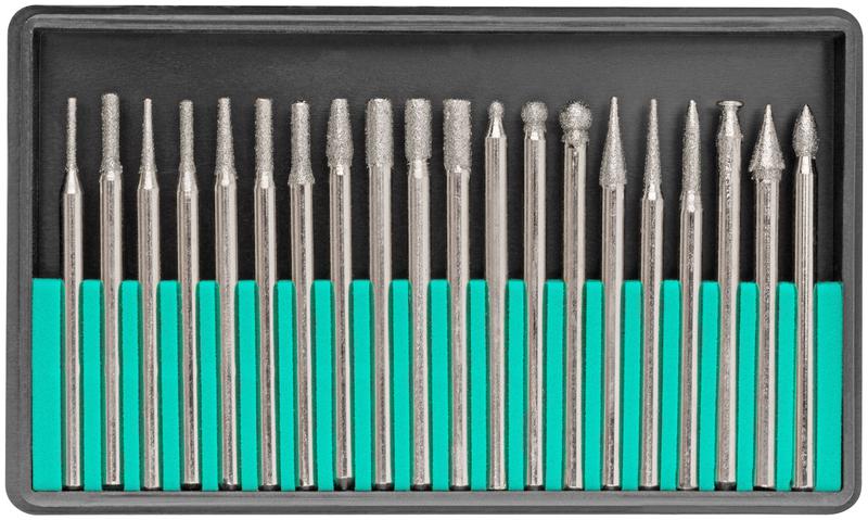Шарошки алмазные FIT IT предназначены для обработки мрамора, керамики, кафельной плитки, дерева, металла и других материалов. Используются для работы с гравировальной машиной. Шарошки изготовлены из качественной инструментальной стали, что обеспечивает их долговечность и надежность в использовании. Режущая кромка содержит порошок из технических алмазов. 20 типоразмеров в комплекте обеспечивают широкий спектр применения.