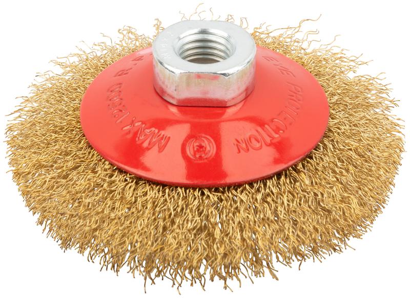 Корщетка-колесо с наклоном гайка М14 стальная латунированная волнистая проволока 100мм FIT 39050
