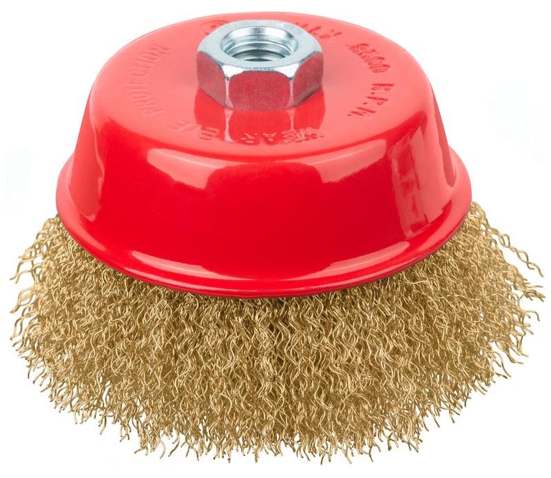 Корщетка-чашка гайка М14 стальная латунированная волнистая проволока 100мм FIT 39270