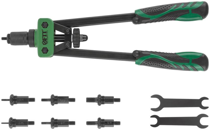 Двуручный заклепочник FIT IT предназначен для работ с резьбовыми заклепками-гайками из алюминия, стали и нержавеющей стали. Рычажно-складной механизм создает высокое усилие во время работы, при этом снижая утомляемость. Литой корпус из алюминиевого сплава обладает высокой прочностью. Фиксация рабочих насадок обеспечивается резьбовыми соединениями. 6 сменных насадок и два ключа для смены насадок в комплекте. Пластиковые прорезиненные накладки на рукоятках предотвращают проскальзывание инструмента во время работы.