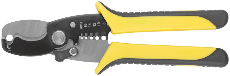 Кабелерез со съемником изоляции FIT IT предназначен для снятия изоляции с одножильных и многожильных проводов диаметром 1,3; 1,6; 2,0; 2,6; 3,2 мм, а также 4,6 мм с помощью верхнего обжима. Подходит для перекусывания изолированных проводов диаметром до 10 мм, стальной незакаленной проволоки диаметром до 2 мм, медной и алюминиевой проволоки диаметром до 4 мм. Кабелерез позволяет разрезать провода, кабели и проволоку из различных материалов. Съемник изоляции эффективно зачищает провода диаметром 1,3–4,6 мм. Заточенное лезвие из хромованадиевой (CrV) стали обладает высокой износостойкостью. Лезвие долгое время остается острым за счет закалки до твердости 52–56 HRC. На рукоятках расположены противоскользящие накладки из резины с текстурной поверхностью. Усиленная пружина облегчает усилие во время работы. Блокиратор на корпусе позволяет безопасно хранить инструмент.