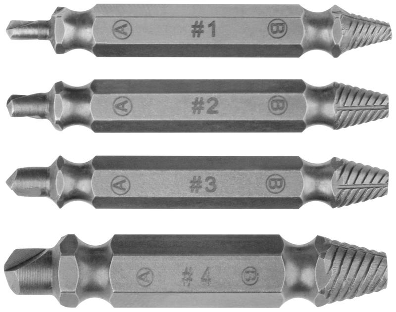 Двусторонние экстракторы FIT IT предназначены для извлечения шурупов и болтов PH/PZ 1,2,3,4 с сорванными шлицами без засверливания (сторона А), а также для любого крепежа, соответствующего рекомендациям по работе (сторона Б). Экстракторы выполнены из хром-молибденовой стали S2, что обеспечивает их прочность и долговечность. 4 экстрактора в комплекте обеспечивают широкий спектр применения.