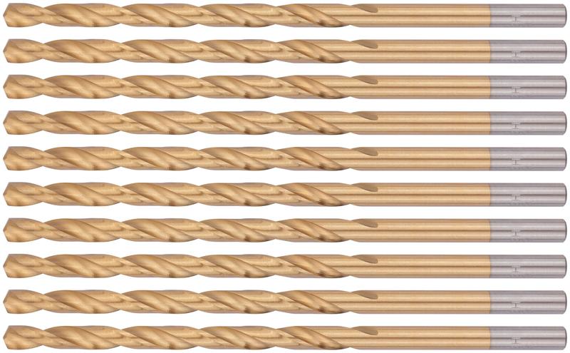 Удлиненные сверла по металлу с титановым покрытием FIT IT предназначены для сверления глубоких отверстий в углеродистых и легированных сталях, серых и ковких чугунах, цветных металлах и пластике. Сверла изготовлены из высококачественной быстрорежущей стали Р9М3, что обеспечивает их долговечность и надежность в использовании. Титановое покрытие увеличивает срок службы оснастки и обеспечивает точное и чистое сверление. Сверла изготовлены методом вышлифовки профиля, что повышает плавность сверления и чистоту готовых отверстий. Крестообразная форма наконечника и угол заточки 135° обеспечивают возможность сверления без предварительного кернения. Сверла имеют высший класс точности А1 и высверливают отверстия с высокоточным диаметром. Цилиндрический хвостовик сверл совместим с патронами большинства дрелей и шуруповертов.