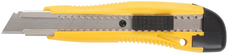 Применяется для резки бумаги, обоев,скотча, картона средней твердости. Острое лезвие с большим ресурсом выполнено из инструментальной стали. Рифленая форма ножа обеспечивает крепкий захват и предотвращает выскальзывание при использовании. Компактный корпус изготовлен из пластика, удобен в использовании и занимает минимальное место.