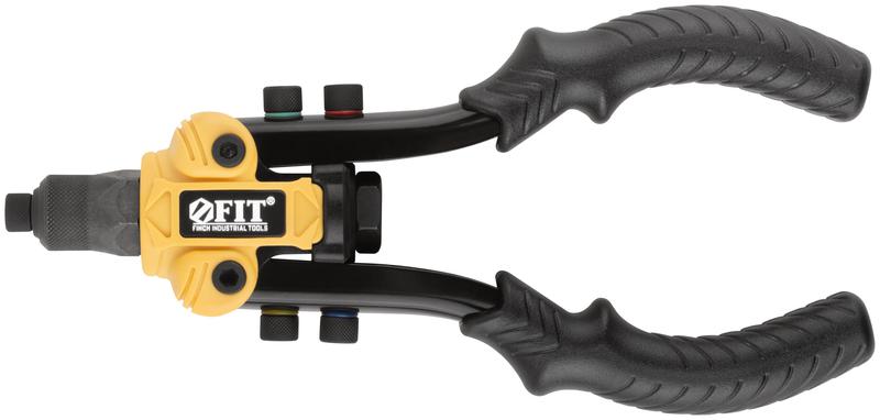 Профи. Двуручный, компактный. Для крепления вытяжных заклепок из алюминия, стали и нержавеющей стали. Рычажно-складной механизм для создания высокого усилия при работе. 5 быстросъемных насадок. Материал: корпус из инструментальной стали и нейлона, трехкулачковый механизм захвата заклепок из хром-молибденовой стали, рукоятки и насадки из инструментальной стали, ПВХ накладки на рукоятках. Упаковка: картонная коробка.