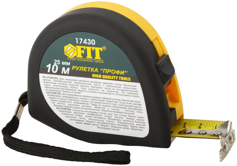Рулетка Профи 10мх25мм калибр. лента; нейлон. покрытие; магн. крючок; эласт. корпус; двойн. стопор черн./желт. FIT 17430