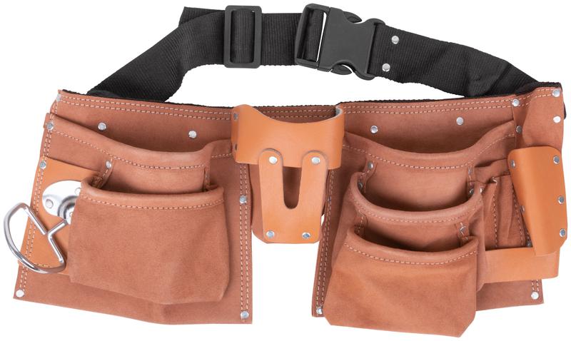 Кожаный пояс для инструмента FIT IT предназначен для переноски инструментов и крепежа во время проведения кровельных, монтажных, слесарных и других видов работ. Пояс изготовлен из натуральной кожи, обладающей высокой прочностью и износостойкостью. Стальная петля для инструмента прочно зафиксирована на заклепках и обеспечивает безопасную переноску тяжелого инструмента. Возможность переноски большого количества инструментов достигается за счет наличия 10 отделений различных размеров. Эластичность карманов позволяет быстро доставать мелкие предметы и крепеж. Поясной ремень имеет возможность регулировки.