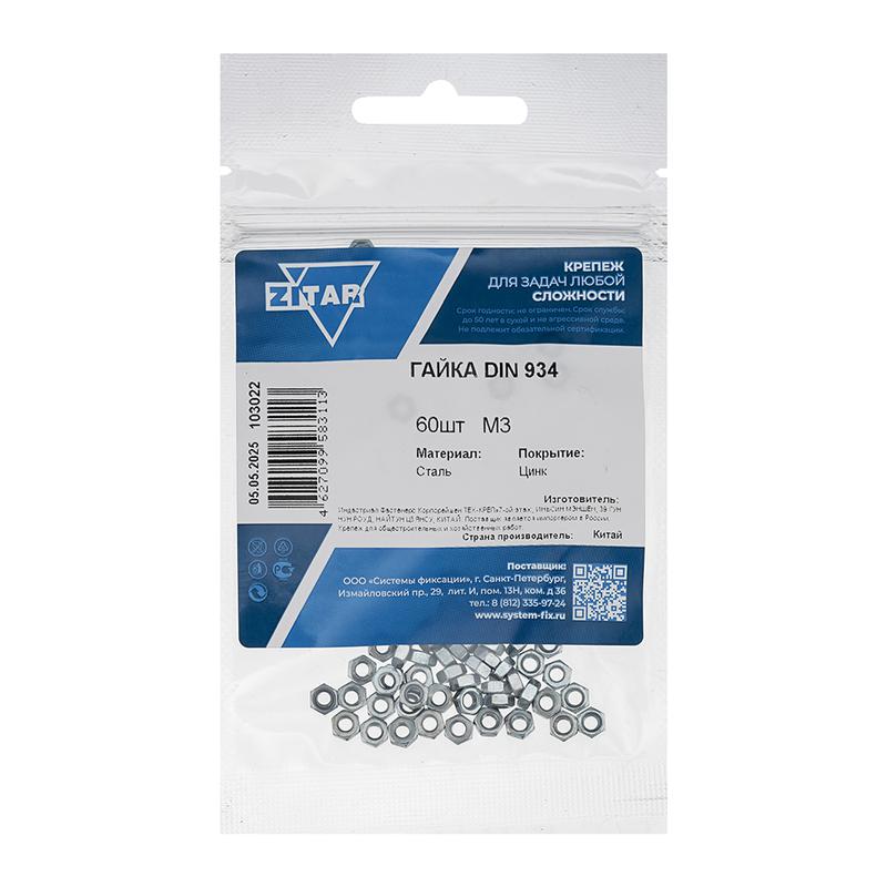 Гайка шестигранная М3 DIN 934 оцинк. (уп.60шт) Zitar 103022