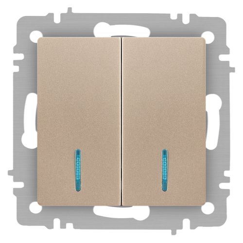 Выключатель 2-клавишный с подсветкой серии Intro Accent скрытой установки механизм цвет шампань 6-105-04. Номинальные характеристики 10А 250В. Выполнен из негорючего термопласта, оснащён винтовыми клеммами. Парные клеммы обеспечивают соединение шлейфом. Монтаж в подрозетник производится и на лапки, и на винты. Рамка приобретается отдельно. В серии представлены рамки до 5 постов: на 1 пост - 6-501-хх, на 2 поста - 6-502-хх, на 3 поста - 6-503-хх, на 6 поста - 4-504-хх, на 5 постов - 6-505-хх (где хх - цветовой код: 01 - белый, 01М - матовый белый, 02 - слоновая кость, 03 - алюминий, 04 - шампань, 05 - антрацит, 06 - перламутр, 07 - графит, 08 - бронза, 09 - титан, 10 - венге, 11 - сосна)