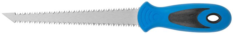 Ножовка по гипсокартону MOS имеет узкое лезвие с зазубренной кромкой и используется для пиления гипсокартонных плит. Заточенное острие обеспечивает легкость протыкания материала перед последующей работой. Ножовка оснащена обрезиненной двухкомпонентной рукояткой, что повышает удобство при работе.