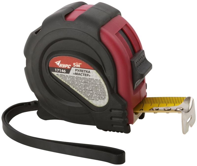 Рулетка КУРС серии "Мастер" предназначена для измерений линейных размеров. Корпус рулетки изготовлен из ударопрочного ABS-пластика, устойчивого к механическим воздействиям. Резиновые накладки на корпусе предотвращают повреждения инструмента при падении или ударе. Рулетку можно крепить на ремне с помощью металлической клипсы. Тканевый ремешок позволяет носить рулетку на руке или хранить в подвешенном положении.